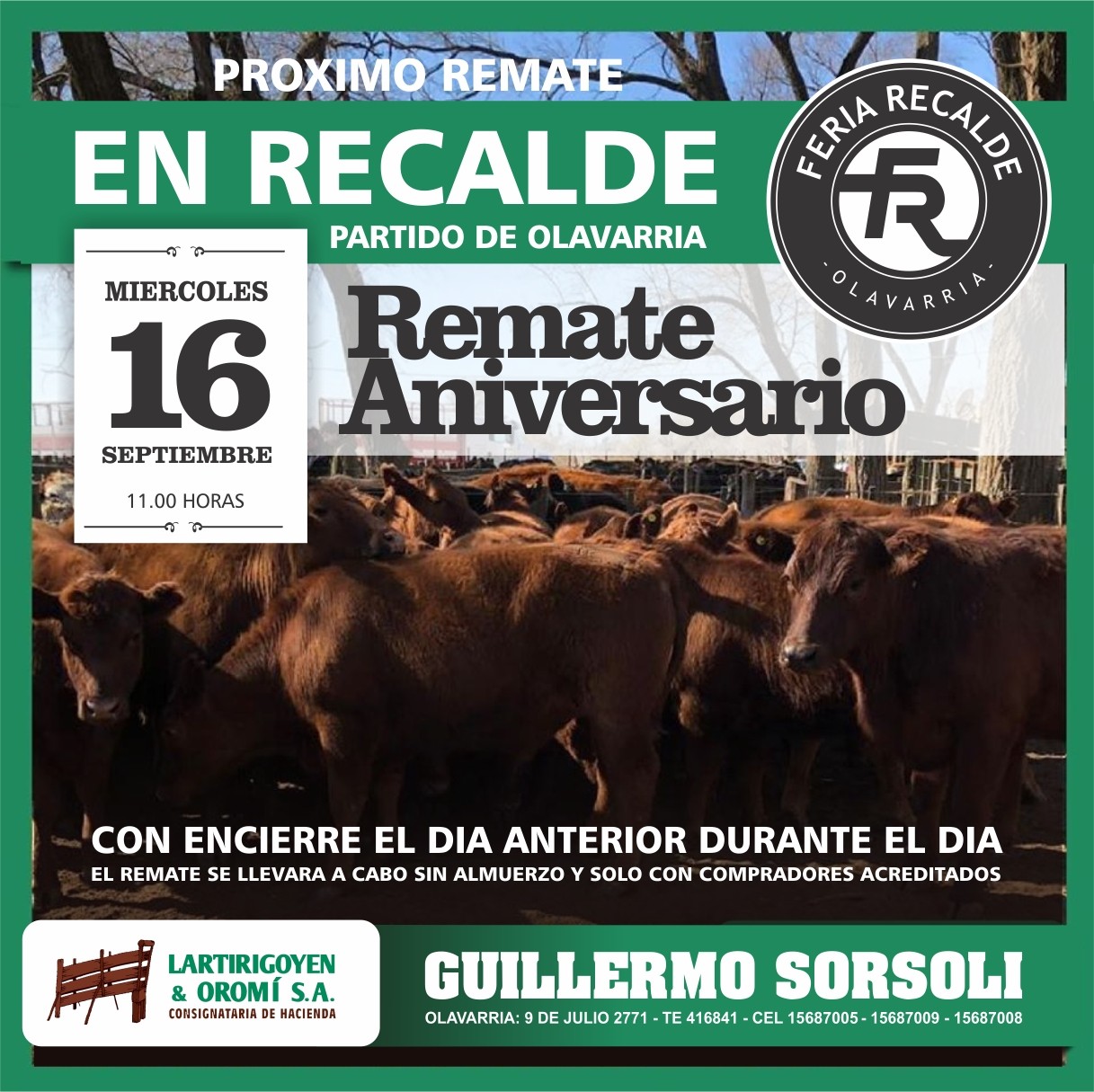 El Remate se llevara a cabo desde las 10.30 hs. en las instalaciones con que cuenta la firma en la localidad de Recalde, Partido de Olavarría con haciendas generales de Gordo Invernada y cría. Para más información contactarse con Guillermo Sorsoli en sus oficinas de 9 de Julio 2771 ó a los teléfonos 02284 416841, 02284 15687005 / 7008 / 7009. Sólo con la presencia de compradores autorizados, sin almuerzo y siguiendo el protocolo establecido para la comercialización de hacienda en remates feria. Más información del remate aquí