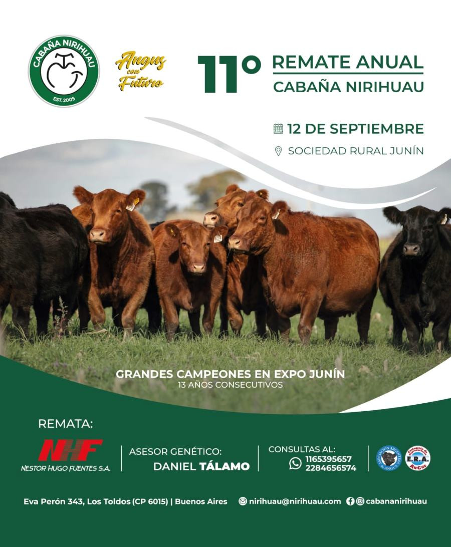 El jueves 12 de septiembre cabaña Nirihuau brindará nuevamente la oportunidad de que los apasionados del angus de primer nivel incorporen su genética, con la 11va. edición del remate «Angus con Futuro» en la Sociedad Rural de Junín.