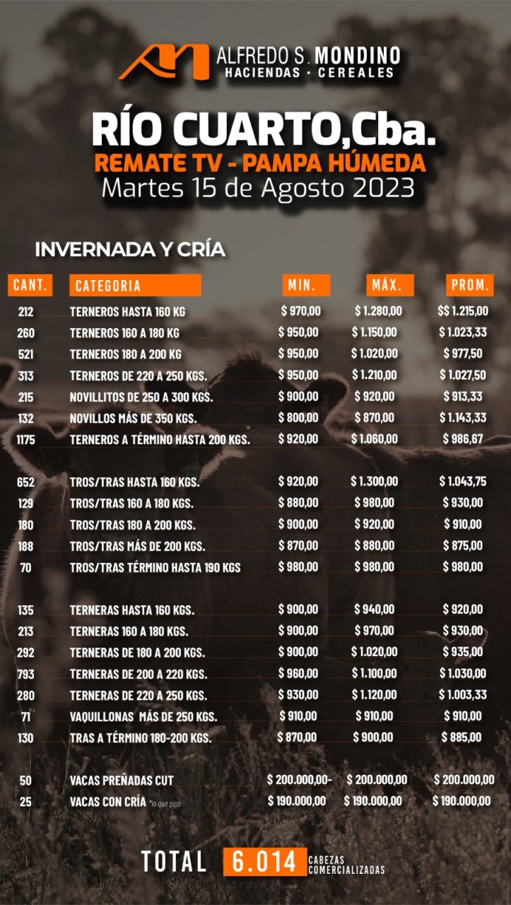 La firma cordobesa subastó 8000 cabezas desde Río Cuarto (Córdoba) con los siguientes resultados obtenidos