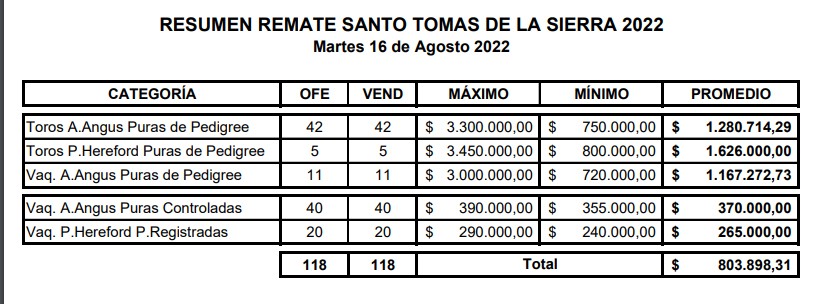 Las ventas se realizaron en vivo por la pantalla de Canal Rural y se vendió el total de la oferta que consistió en 53 Toros Puros de Pedigreé (Angus Negros y Colorados, y P. Hereford) Toros Angus con aptitud para vaquillonas, 11 Vaquillonas Puras de Pedigreé (Angus Negras y Coloradas, de Selección) y 60 Vaquillonas Puras Controladas y Puras Registradas (Parición Primavera, Preñadas por I.A.