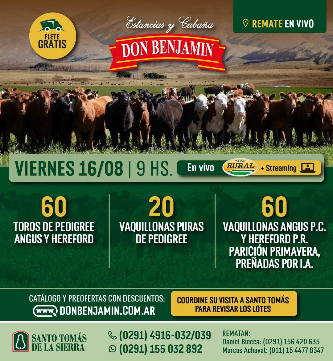 El 16/8 saldrán a la venta 60 toros PP Angus y Hereford, 20 vaquillonas PP y 60 Angus PC y Hereford PR inseminadas por IATF de parición primavera. El remate será en vivo y vía streaming por Canal Rural, destacándose como condiciones de venta flete gratis y diversos descuentos en preofertas que pueden consultarse en la web de la cabaña: www.donbenjamin.com.ar. También pueden coordinarse visitas a Santo Tomás de la sierra par revisar los lotes, a los teléfonos que figuran al pie de esta nota.
