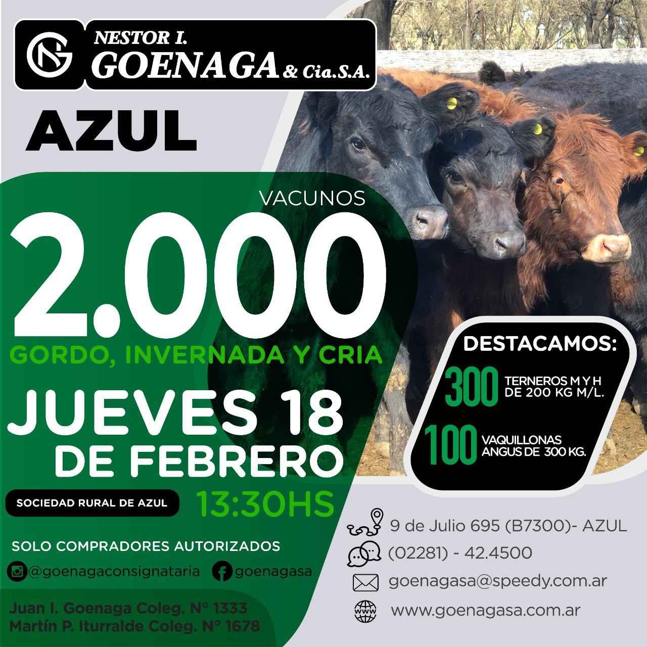 La casa azuleña, que este año cumple 30 años de remates, anuncia su venta mensual con haciendas de gordo, invernada y cría. Para más información; 9 de Julio 695, Azul, Prov. de Buenos Aires (B7300) +5492281658618 +5492281667590 info @ goenagasa.com.ar wwwgoenagasa.com.ar . Más info del remate