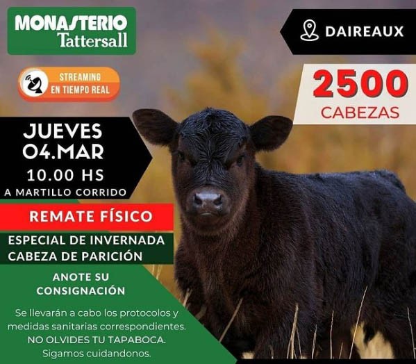 Remate físico con 2500 cabezas de invernada cabeza de parición desde las 10 horas a martillo corrido y transmición en tiempo real por streaming