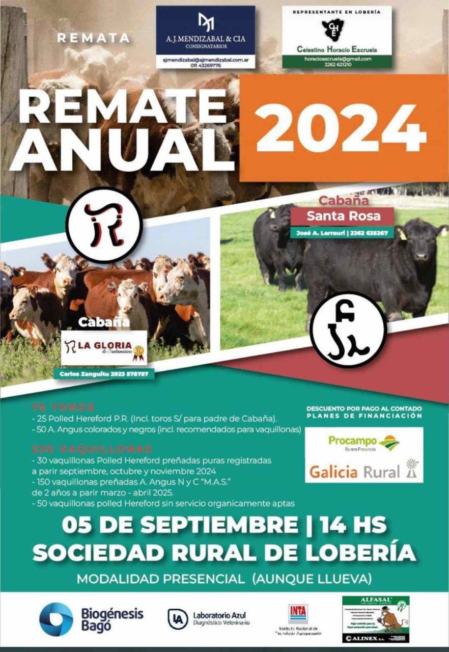 Lo mejor de las razas Angus y Hereford en un solo lugar. Con el acompañamiento de A.J. Mendizábal, el 5/9 desde las 14 saldrán a la venta 75 toros y 230 vaquillonas de las dos razas de manera presencial en la Sociedad Rural de Lobería, con descuentos por pago contado y planes de financiación.