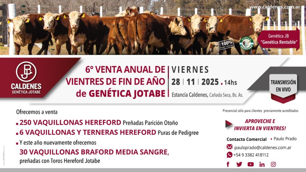 Caldenes S.A. prepara para el viernes 28 de noviembre en sus instalaciones de Cañada Seca en la provincia de Buenos Aires su 6º Venta Anual de Vientres de Fin de Año, con lo mejor de la genética Hereford y Braford desarrollada por Cabaña Jotabe. Un modelo de producción integral que combina innovación, trayectoria y servicio al productor.