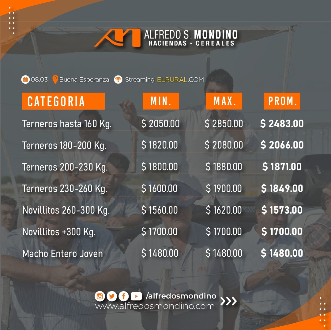 Con un muy buen encierre de 1.300 cabezas, la consignataria Alfredo S. Mondino cerró su remate mensual en Buena Esperanza durante el que se destacó la recuperación de precios para los gordos y los valores firmes que alcanzaron todas las categorías de novillos.