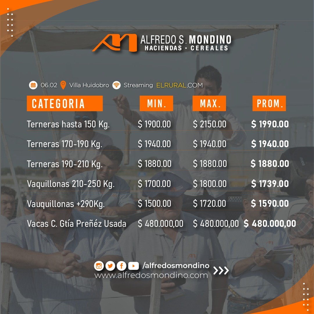 Indicó que la vaquillona se comercializó entre los $1.850 y $2.100, mientras que las vacas preñadas, con 30, 60 y 90 días de plazo, promediaron los $600.000.