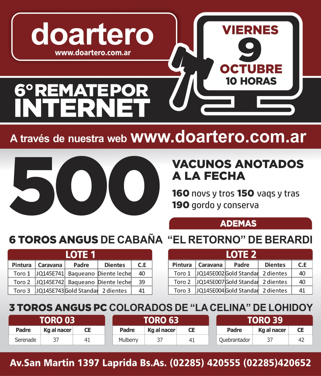 El Remate se desarrollará a través de la web www.doartero.com.ar desde las 10 horas con 500 vacunos anotados de gordo, invernada y cría