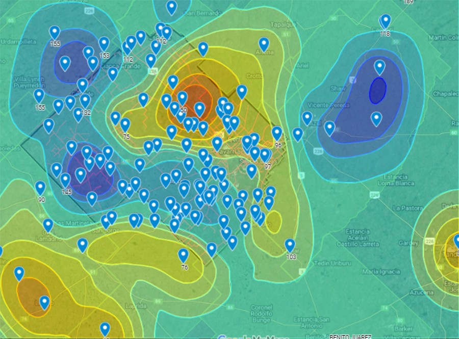 Gracias al trabajo del Lic. en Geografía Martín Orradre, de la empresa Tecnología Satelital para el Agro presentamos el mapa de interpolación de precipitaciones donde en forma on line se pueden apreciar los sectores de mayor y menor precipitación mediante colores que caracterizan zonas de comportamientos de PP homogéneos con el detalle de los valores de lluvias caídas y el lugar donde se tomó cada uno.