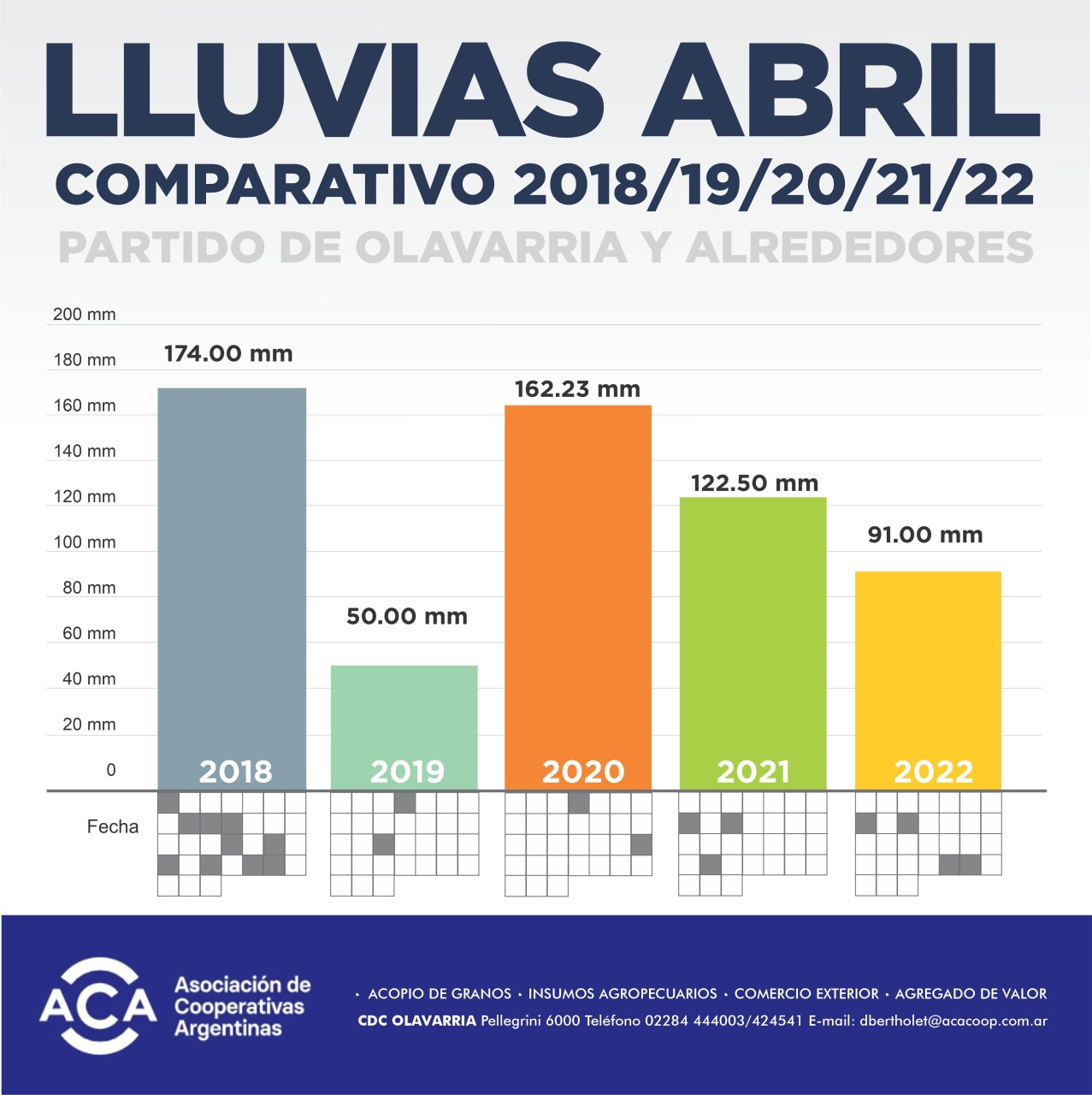 Comparativo quinquenal de promedios de lluvias del mes de abril en base a los datos aportados por la comunidad de ZonaCampo. Presentado por Asociación de Cooperativas Argentinas.