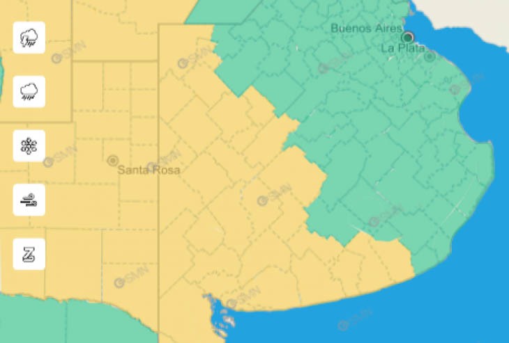 El aviso abarca al extremo oeste, desde Patagones hasta General Villegas; al sector costero, desde Villarino hasta Lobería; y a municipios del centro como Carlos Casares, Bolívar y Olavarría.