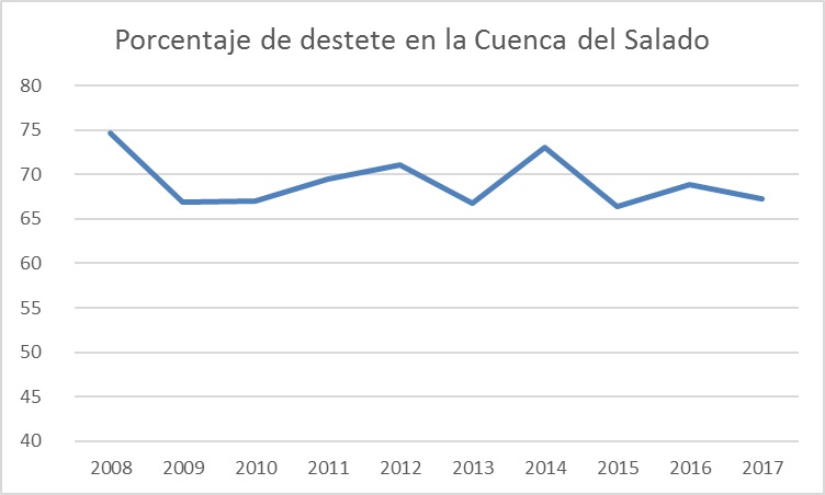 Al igual que toda la región pampeana, la Cuenca del salado posee los índices de destete más altos del país. Mientras el promedio nacional en los últimos años fue del 60%, en Cuenca del Salado alcanzó del 69%. «Si analizamos la evolución de la relación ternero/vaca en los últimos 10 años en la Cuenca, vemos que esta se mantiene, y que a pesar de los bajos índices que se observaron después de la sequía 2008/09 no hemos podido recuperar la eficiencia que mantuvimos en la década anterior» comentan los técnicos del INTA. «No se observa un incremento del porcentaje de terneros logrados», sin embargo, alertan que «se debe tener en cuenta que hay más cantidad de vacas en la misma superficie, por lo que mantener los índices reproductivos puede verse también como un desafío». De todos modos, «todavía queda un importante margen de mejora, puesto que estudios de monitoreo de rodeos de cría realizados por el INTA, demuestran que los establecimientos que aplican tecnologías básicas de manejo alcanzan índices cercanos al 80%».