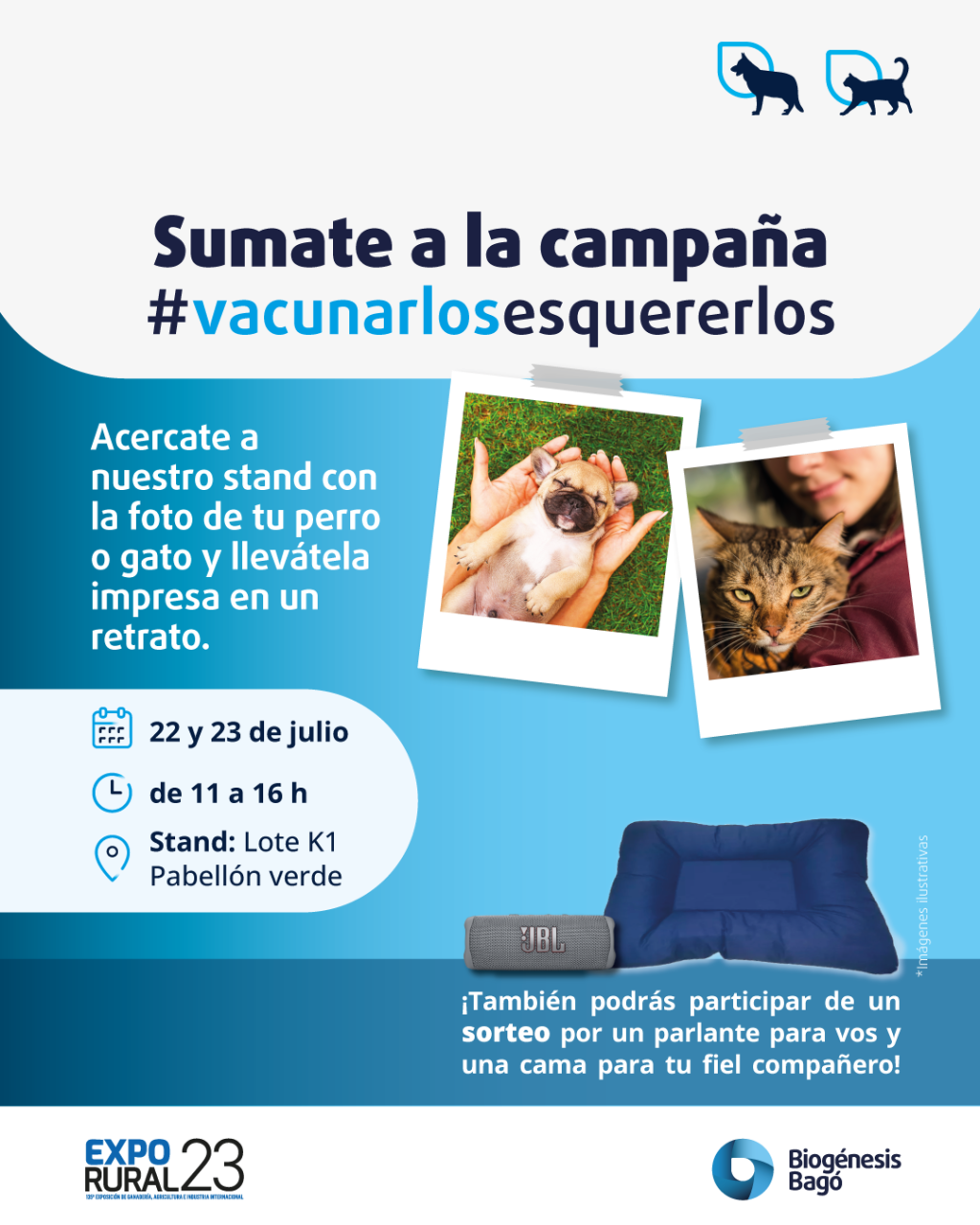 Con el lema «Vacunarlos es querelos» quienes se acerquen al stand de Biogénesis Bagó podrán conversar con los veterinarios sobre el cuidado de los animales y las prácticas de tenencia responsable. Además, acercando una foto de su perro o gato podrán canjearla por un retrato impreso.