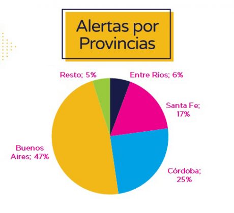 «Buenos Aíres lidera el ranking con el 47% de las alertas, mientras que le siguen Córdoba con el 25%, Santa Fe con el 17% y Entre Ríos con el 6%. En los cuatro casos, las alertas negativas se concentran en las zonas más afectadas por los excesos hídricos durante el último año», explicita el estudio.