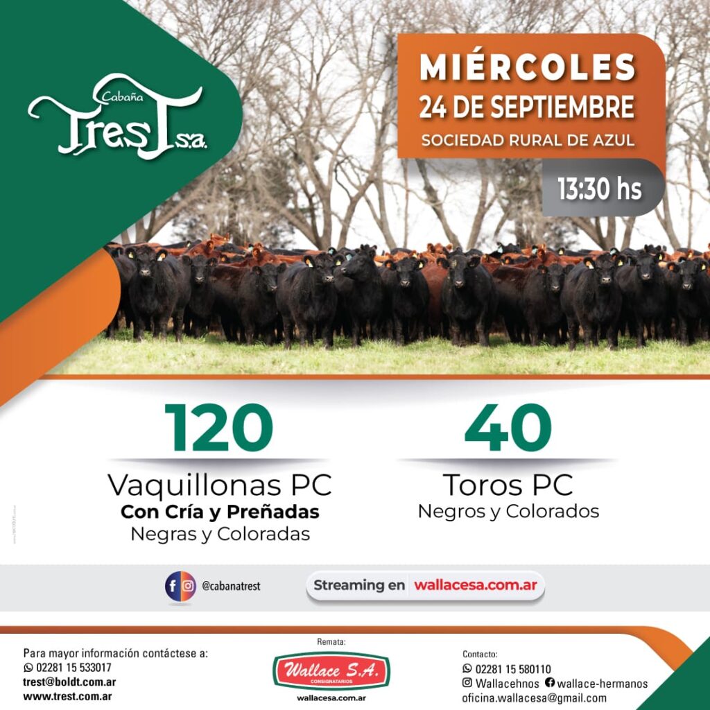 Con la satisfacción de haber vendido la totalidad de la hacienda en su remate del 29 de agosto en el MAG, Cabaña Tres T se prepara para un nuevo desafío esta vez de local: el miércoles 24 de septiembre, desde las 13:30 horas, realizará en la Sociedad Rural de Azul su clásico remate junto a Wallace SA. En la pista saldrá a venta una fuerte selección de reproductores y vientres Angus, con transmisión en vivo por wallacesa.com.ar y la expectativa de repetir el entusiasmo demostrado por compradores y nuevos clientes en la cita anterior.