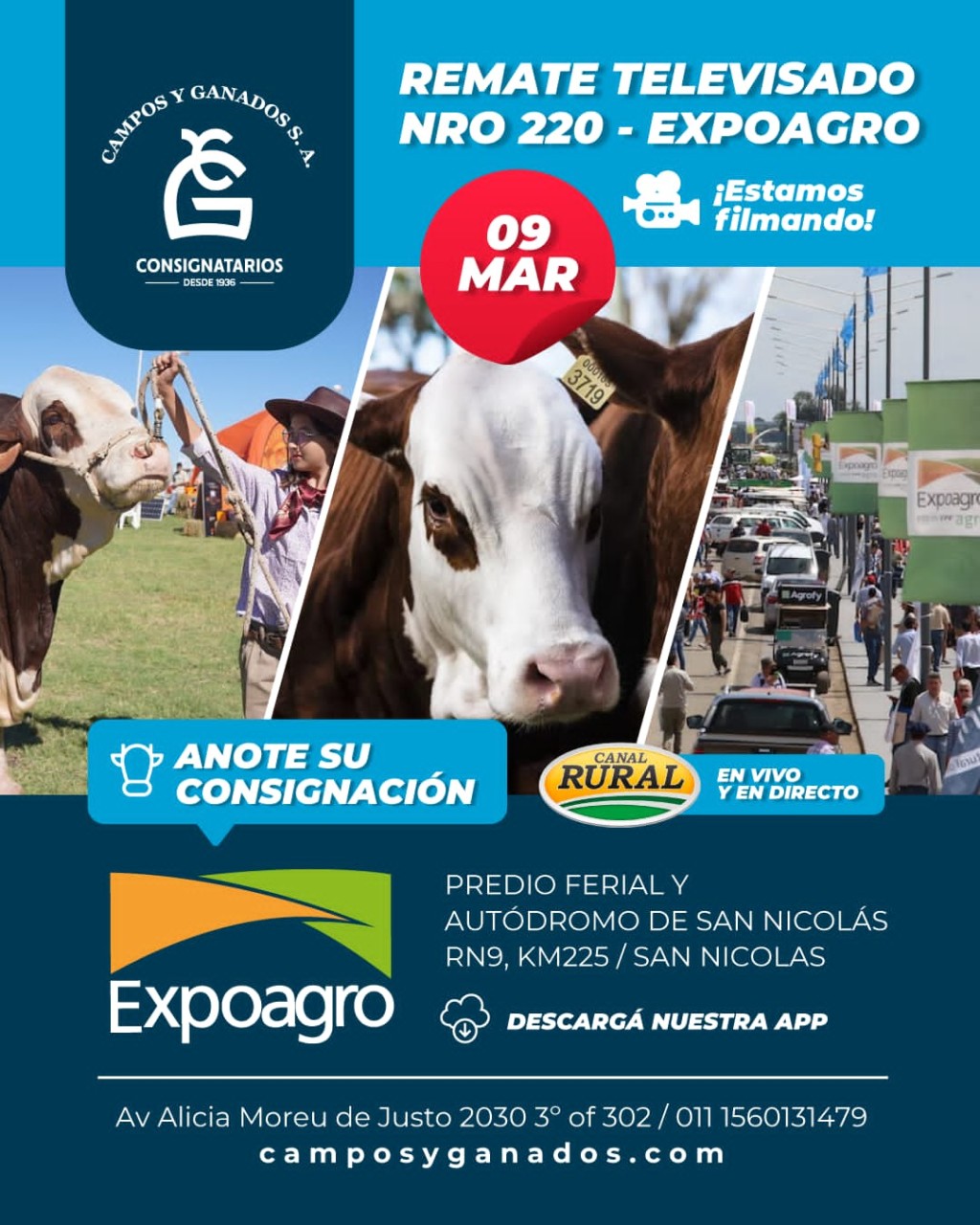 En ese marco, ya están en marcha los preparativos para el REMATE TELEVISADO de la firma Campos y Ganados, el N° 220 de la firma y que será emitido en vivo el jueves 9 de MARZO por CANAL RURALParticipar del mismo es sencillo, contactando para todos los detalles al representante local Germán Ceriani, quien destacó la necesidad de hacerlo con tiempo para presentar y filmar los lotes.