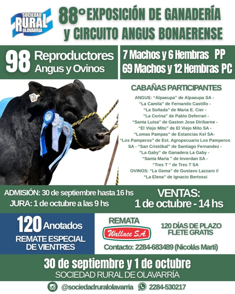 La Sociedad Rural de Olavarría confirmó el cierre de inscripciones para la 88ª Exposición de Ganadería y Circuito Angus Bonaerense, que se desarrollará los días 30 de septiembre y 1° de octubre en el predio ferial de la entidad. En total se anotaron 98 reproductores pertenecientes a 14 cabañas de la Provincia de Buenos Aires, consolidando a la muestra como una de las más relevantes del calendario ganadero regional.