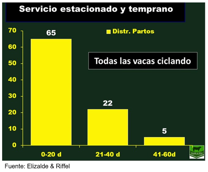 Asimismo, los terneros ‘cabeza’ de parición alcanzan un 10% más de peso al destete que los ‘cola’, ya que nacieron antes y llegan con mayor kilaje a ese momento. «Al mismo tiempo, los terneros que nacen al final son apenas el 5% y aun así son tempranos, nacen entre los días 41-60, es decir que ya no se ve la cola típica de un servicio tradicional, con 15% de terneros paridos entre los 60 y 90 días», explicó. Y agregó: «Está demostrado que el aumento combinado del porcentaje de preñez y del peso al destete mejora el margen bruto de la cría un 25%-30%».