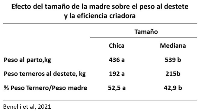 Un tema muy estudiado es el tamaño de la vaca adulta que tiene una enorme influencia en la cantidad de kilos de ternero por vaca que se terminarán destetando. Para visualizar su impacto, presentó un estudio de la Universidad de Nebraska, publicado en 2021, en el cual durante 20 años se hizo un seguimiento de vacas chicas de 436 kg promedio al parto contra medianas de 539 kg.