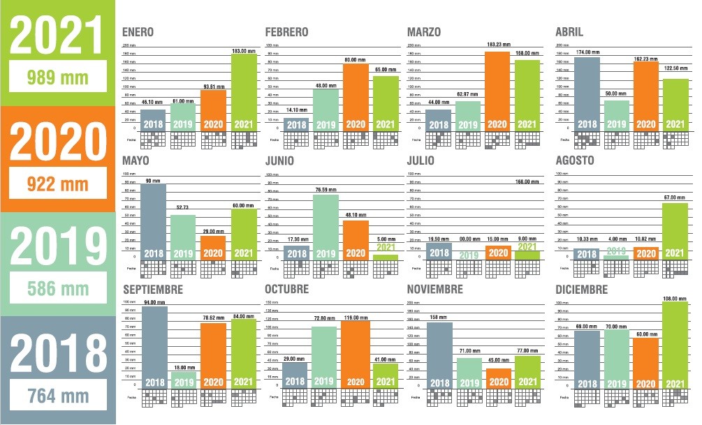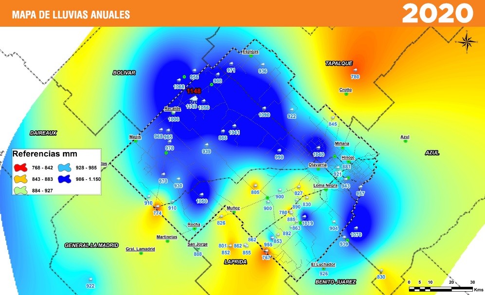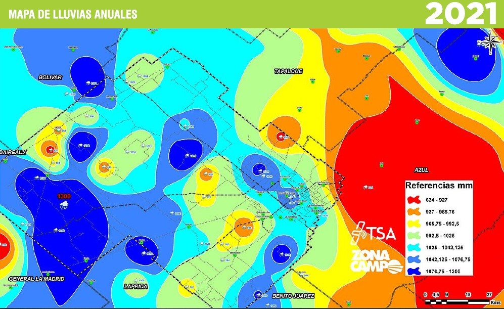 «Primero hay que resaltar los gráficos, destacar el impecable trabajo que se ha realizado, así también como los diagramas con los totales y sub totales puestos tanto en gráficos de mapa como de barras. Con respecto a los registros de lluvia hay que tener en cuenta que por ejemplo 2018 estábamos dentro de un «Niño» que se iba debilitando y entramos a ese 2019 con un Niño en fase neutra. Ese Niño q se debilitó dejó un 2020 con un invierno seco y uno de los más cálidos. Yendo al 2021, fue un poquito mejor con respecto a milimetraje. En general han sido 4 años bastantes secos, si miramos que en Olavarría el promedio ronda los 900 mm»