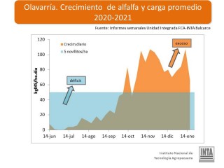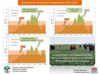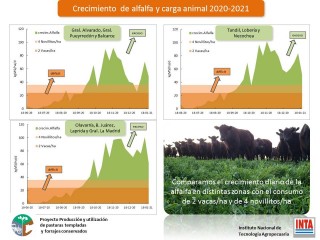 «La línea recta que se ve en los gráficos significa el crecimiento promedio, que para el caso del festuca, entre junio y fin de año, o sea segundo semestre del 2020, fue el equivalente de una carga de dos vacas por hectáreas. Todo lo que esté por encima de esa línea es superávit de pasto y por debajo es déficit. Con el modelo de alfalfa es lo mismo, pero tomamos el valor de cuatro novillitos de 300 kilos y cada una de esas curvas representa a cada una de las especies» , agregó.