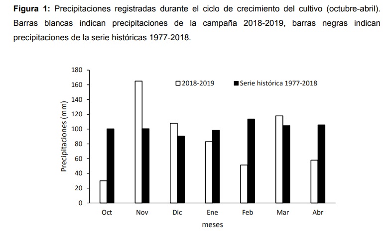 En cuanto a la caracterización climática de la campaña los profesionales indican que «las precipitaciones registradas durante el ciclo del cultivo definido entre los meses de octubre y abril (613 mm) fueron inferiores a las registradas para el promedio histórico registrado en el partido durante el período 1971-2017 (714 mm)» (Figura 1). Las precipitaciones de noviembre (165 mm) «permitieron lograr un nacimiento rápido y homogéneo de todos los híbridos». Estas condiciones se mantuvieron durante todo el período crítico (fin de diciembre, principios de enero), lo que, según los técnicos del INTA «permitió asegurar el número de granos por planta (principal componente del rendimiento)». «Las condiciones de llenado de grano fueron buenas, tanto en precipitaciones como en temperaturas, lo que permitió lograr muy buenos rindes.