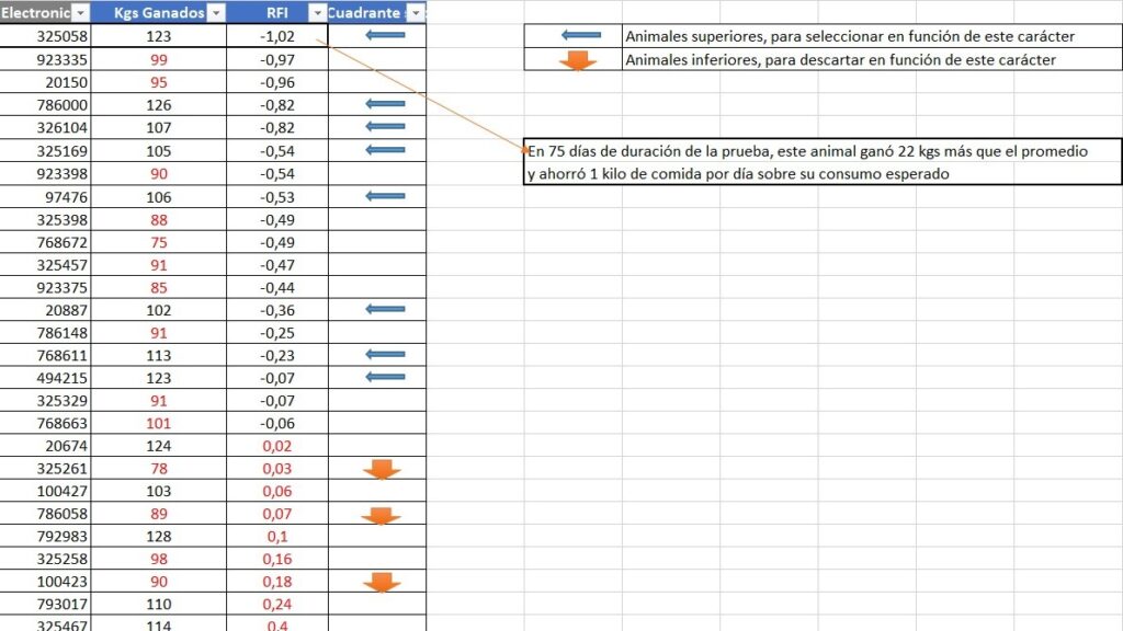 La sigla RFI significa Consumo Residual de Alimento (en inglés, Residual Feed Intake) y es una medida de eficiencia que compara la cantidad de alimento consumido por un animal con la cantidad esperada para su mantenimiento y crecimiento. Un RFI negativo indica que un animal es más eficiente porque consume menos de lo esperado para producir el mismo aumento de peso. Esta métrica permite seleccionar reproductores genéticamente más eficientes, lo que puede reducir costos de producción y mejorar la rentabilidad.