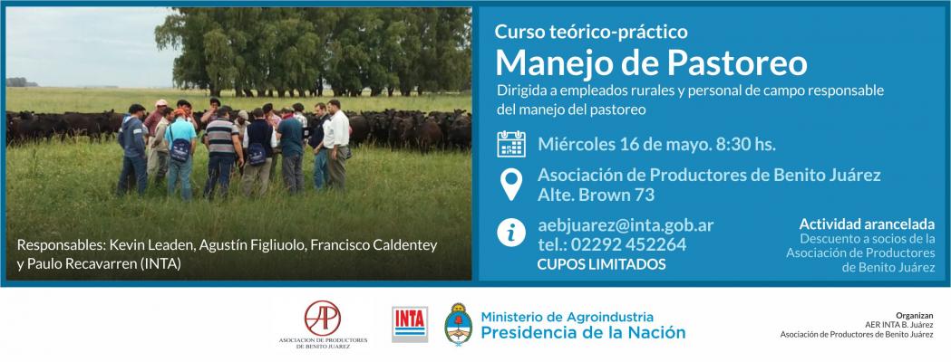 Organizado en forma conjunta por AER INTA Benito Juárez y la Asociación de Productores de Benito Juárez este Curso Teórico-Práctico sobre Manejo de Pastoreo se llevará a cabo en la sede de la Asociación de Productores de esa localidad desde las 8:30 hs. Los organizadores informaron que los cupos son limitados