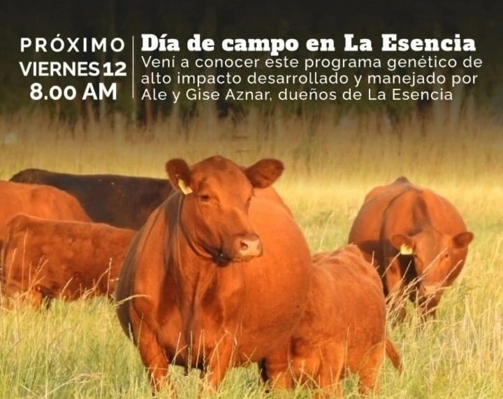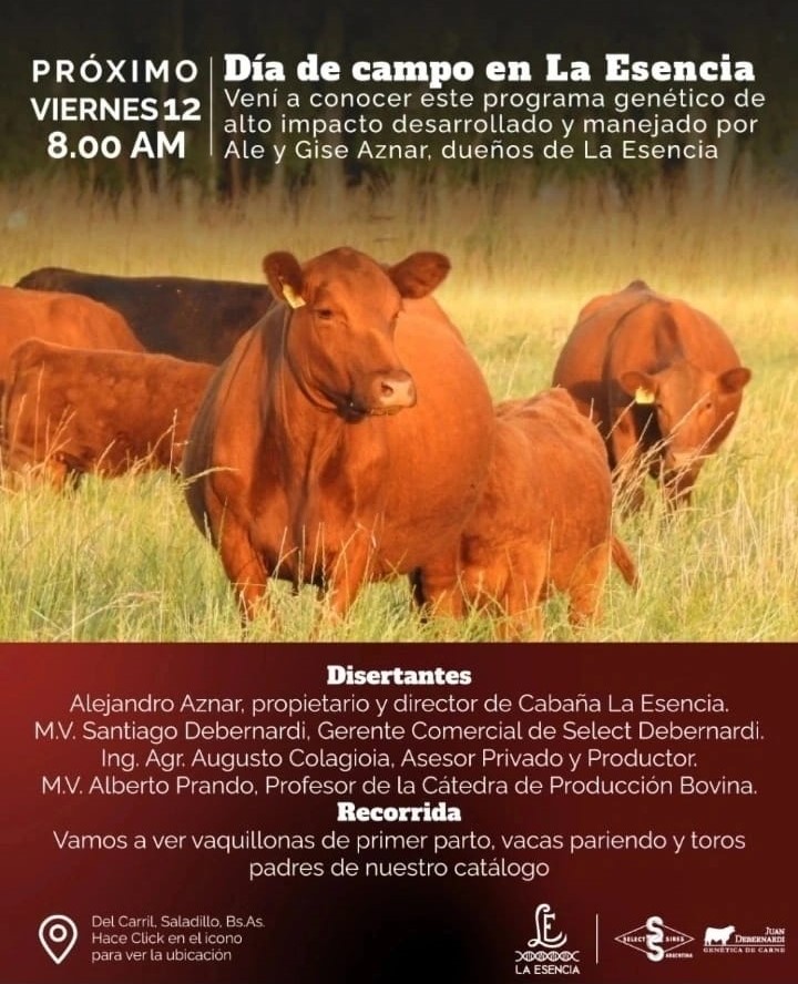 Este viernes 12 de agosto desde la 8:00 de la mañana tendrá lugar día de campo en la Cabaña La Esencia, de Alejandro y Gisela Aznar, quienes oficiarán de anfitriones y presentarán en primera persona el programa genético de alto impacto que vienen desarrollando de la mano de Select Sires Juan Debernardi desde hace ya varios años. La cabaña está ubicada en Del Carril, partido de Saladillo (Google Maps -35.51876586118759, -59.521532413511814)