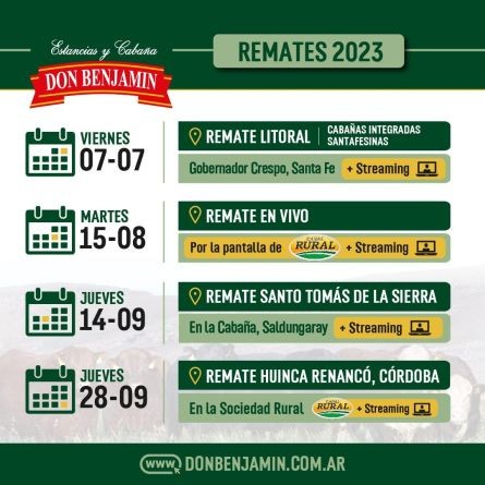 El calendario anual se completará con 3 fechas más. El martes 15 de agosto en vivo por la Pantalla de Canal Rural y por streaming a través de www.donbenjamin.com.ar, el Jueves 14 de septiembre en la Cabaña de Saldungaray y por streaming para cerrar el año el 28 de septiembre desde Huinca Renancó junto a Alfredo S, Mondino, en vivo por la Pantalla de Canal Rural y por streaming a través de www.donbenjamin.com.ar