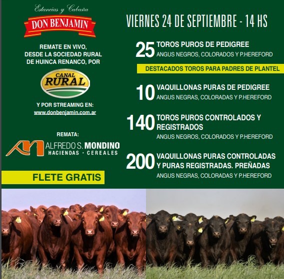 La firma prepara su último remate del año, que saldrá televisado por Canal Rural a partir de las 14, y simultáneamente por streaming por la página del medio, la de la empresa Don Benjamín (ingresar aquí para acceder) o la página de Alfredo S. Mondino. También se puede ver por Zoom, o sea que habrá plataformas y opciones para todos los gustos.