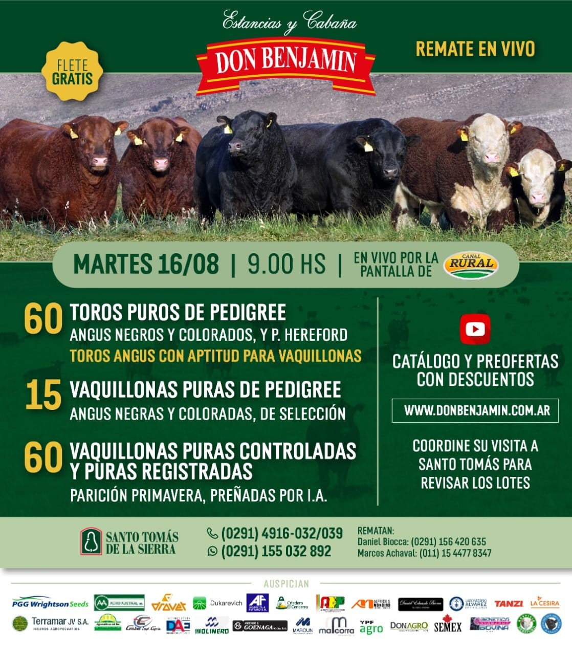 El próximo martes 16 de agosto desde las 9.00 horas en vivo por la pantalla de Canal Rural saldrán a venta 60 Toros Puros de Pedigreé (Angus Negros y Colorados, y P. Hereford) Toros Angus con aptitud para vaquillonas, 15 Vaquillonas Puras de Pedigreé (Angus Negras y Coloradas, de Selección) y 60 Vaquillonas Puras Controladas y Puras Registradas (Parición Primavera, Preñadas por I.A.