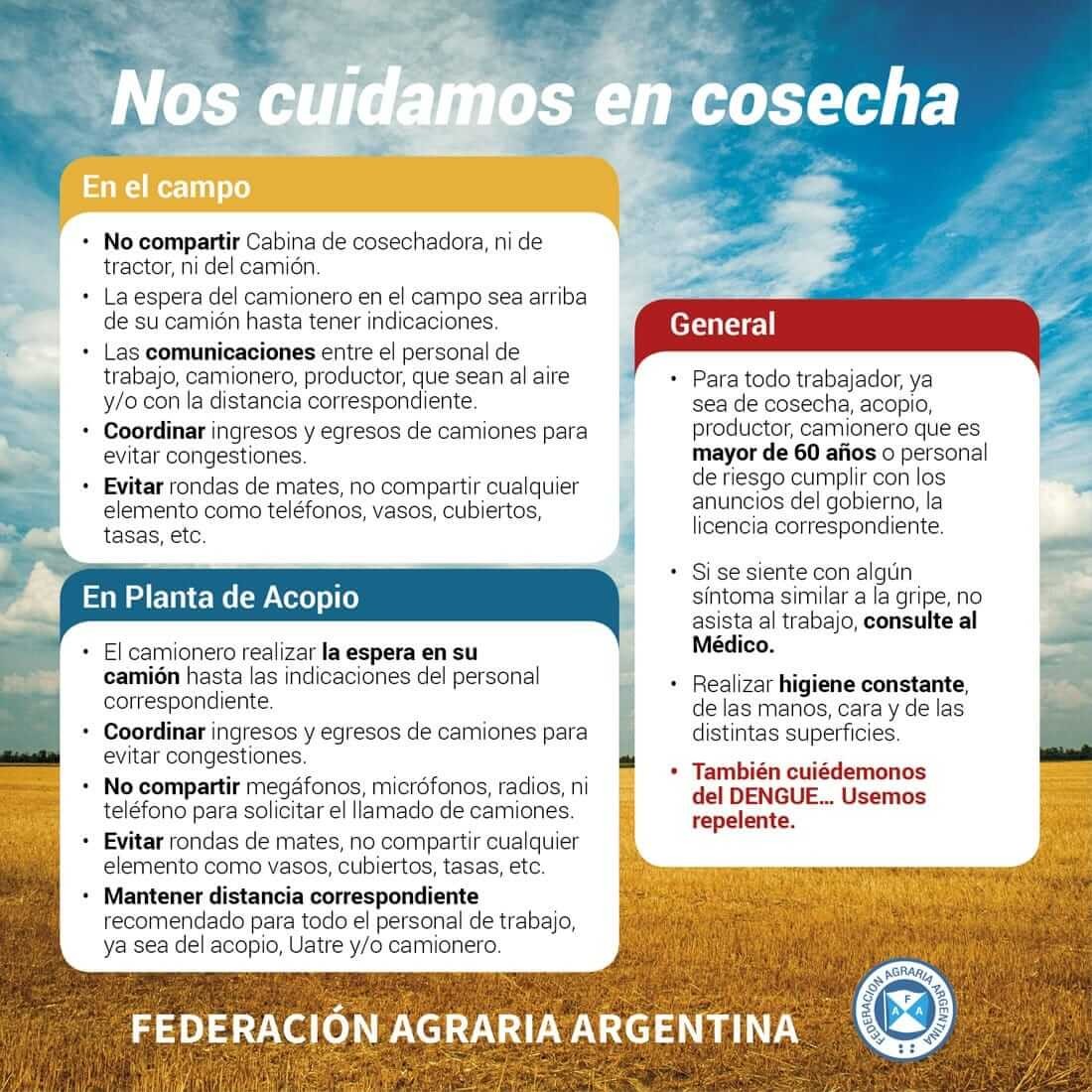 En ese marco, Federación Agraria Argentina emitió una serie de recomendaciones para quienes trabajan en la cosecha, que incluyen consejos como no compartir cabinas y evitar rondas de mate.