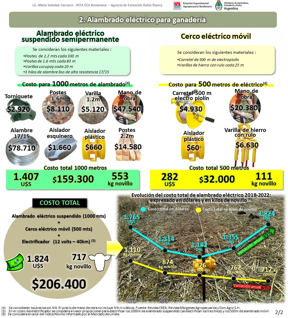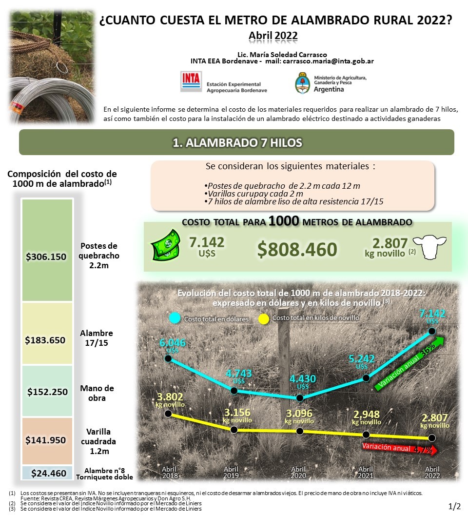 Según un trabajo del Inta Bordenave (Buenos Aires), el costo del material y de la mano de obra de mil metros de alambrado de siete hilos, arranca la serie en abril del 2018 con 3.802 kilos de novillo, para bajar a 3.156 kilos en 2019, a 3.096 kilos en el 2020, a 2.948 kilos en el 2021 y a un costo de 2.807 kilos de novillo en abril del corriente año.
