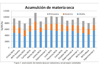 Con estos datos los profesionales de INTA pudieron observar que «siete variedades se encuentran por debajo del promedio y el resto lo superan». Sin embargo «no existen grandes diferencias en la acumulación total de materia seca entre variedades en el período de evaluaciones».
