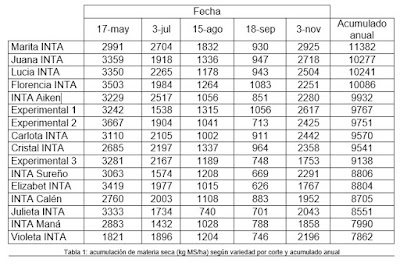 Al momento de la cosecha del ensayo los técnicos determinaron que «la acumulación total de materia seca de las distintas variedades en el período analizado varió entre 7.989 kg MS/ha (Violeta INTA) y 11.381 kg MS/ha (Marita INTA)». El promedio de acumulación de materia seca de todas las variedades fue de 9.400 kg MS/ha.»