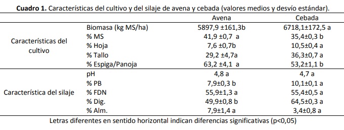 Con los resultados obtenidos y mediante una comparación de medias, los profesionales pudieron observar que «la cebada mostró mayor rendimiento en kilogramos de materia seca por hectárea, con un menor porcentaje de esta última». La biomasa aportada por la cebada «contenía mayor proporción de hojas respecto de la avena, sin diferir el porcentaje de tallo entre ambos verdeos». En cambio, «la proporción de inflorescencia fue mayor en la avena». Asimismo los profesionales advierten que «con ambos cultivos se logró una buena fermentación de los silajes llegando a pH menores a 5».