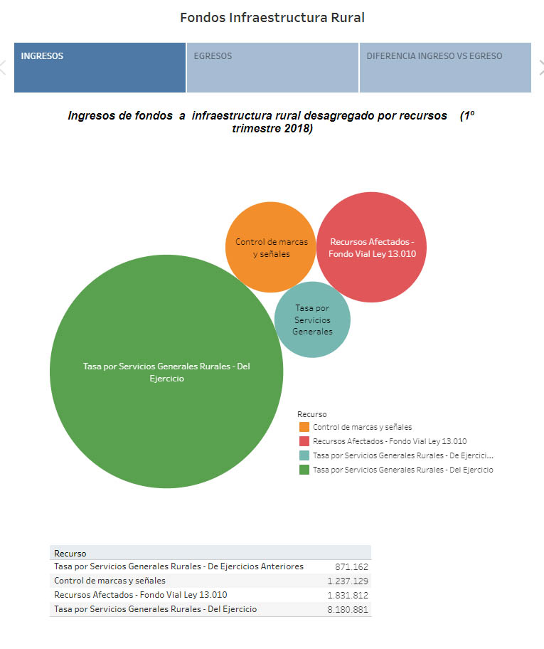 El informe muestra gráficos que representan la inversión en materia de infraestructura rural, en el primer trimestre del corriente año, con los trabajos por zona, con detalle de las empresas a cargo, descripción del tipo de tareas y detalle de los recursos.