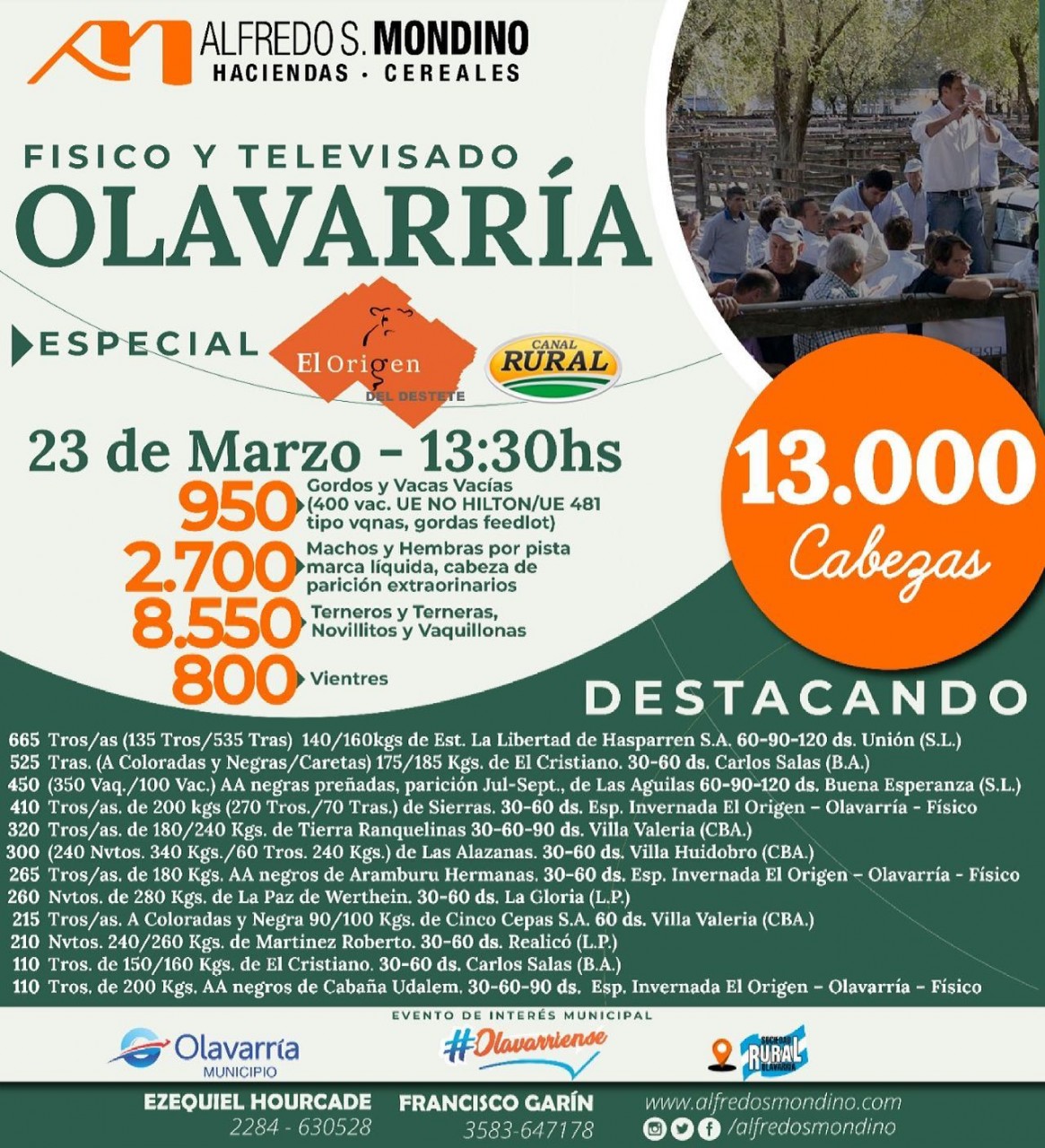 Mañana desde las 13.30 horas tendrá lugar este gran remate Televisado po Canal Rural desde Olavarría, con 13.000 cabezas a la venta incluidos 2700 por pista. Extraordinarios lotes de terneros, terneras y vientres