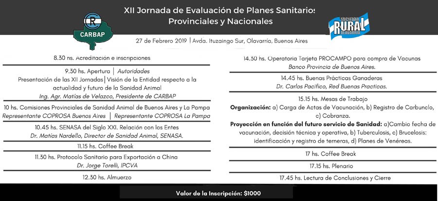 La prevención sanitaria tiene una vital importancia en el desarrollo de la ganadería y por ese motivo CARBAP promueve la participación y compromiso de los productores. En ese sentido, y organizado junto a la Sociedad Rural de Olavarría, el próximo 27 de febrero se llevará a cabo en nuestra ciudad la 12° Jornada de Evaluación de Planes Sanitarios Provinciales y Nacionales de la que participaran autoridades y delegados de CARBAP y representantes de fundaciones y entes de vacunación.