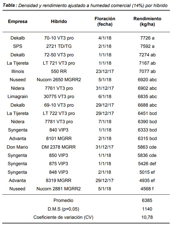 Finalizada la evaluación los técnicos observaron que «la fecha de floración masculina (antesis) fue diferente entre híbridos. El híbrido más precoz fue el Illinois 550 RR, el cual llegó a antesis el 23/12/17, apenas 60 días después de la emergencia (DDE). Luego se ubicó una franja de 13 híbridos cuya floración se registró entre el 29 de diciembre del 2017 y el 2 de enero del 2018». Por último se ubicaron los restantes 5 híbridos, cuya floración se registró después del 4 de enero del 2018. Asimismo los técnicos el INTA indican que «se observaron diferencias significativas (p<0,0001) en el rendimiento en grano», con un «rendimiento promedio ajustado a 14% de humedad de 6385 kg/ha, con un máximo de 7726 kg/ha (Dekalb DK 70-10), y un mínimo de 4568 kg/ha (Nuseed Nucorn 2881 MGRR2)» (Tabla).
