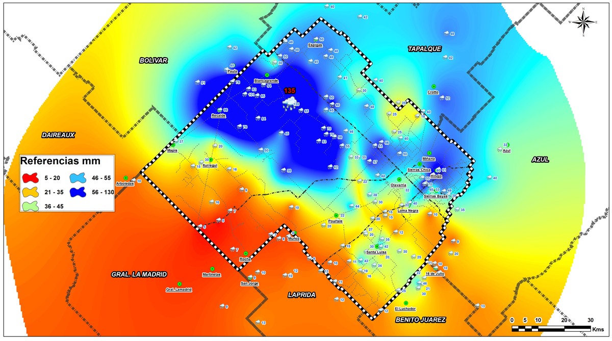 Mapa elaborado por la Dirección Agropecuaria perteneciente a la Secretaría de Desarrollo Económico de la Municipalidad de Olavarría en base a los datos brindados por la comunidad de usuarios de los grupos de lluvias de ZonaCampo. En este mapa se pueden observar los sectores de mayor y menor precipitación mediante colores que caracterizan zonas de comportamientos de PP homogéneos.