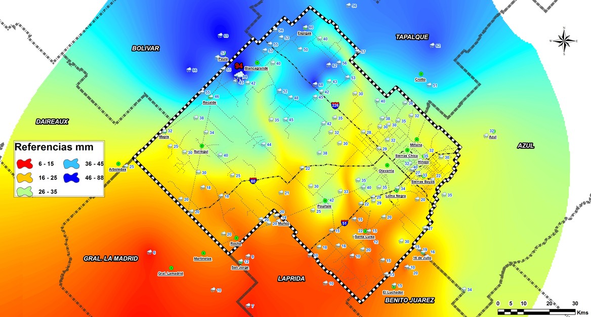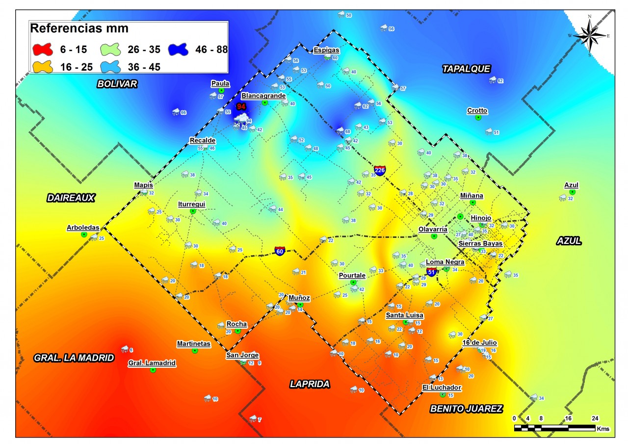 Mapa elaborado por la Dirección Agropecuaria perteneciente a la Secretaría de Desarrollo Económico de la Municipalidad de Olavarría en base a los datos brindados por la comunidad de usuarios de los grupos de lluvias de ZonaCampo. En este mapa se pueden observar los sectores de mayor y menor precipitación mediante colores que caracterizan zonas de comportamientos de PP homogéneos.