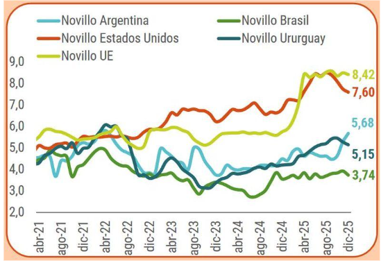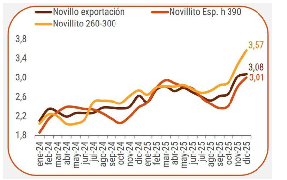 En materia de precios, el informe señala que hacia fines del año los valores de la hacienda muestran niveles atractivos en dólares. El novillito de 260 a 300 kilos para invernada se ubica en 3,57 dólares por kilo, el novillo pesado de exportación en 3,08 dólares, y el novillito liviano (hasta 390 kilos) en torno a 3,01 dólares por kilo.