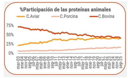 En el mercado interno, el consumo aparente de proteínas animales se ubicaría en torno a los 120 kilos per cápita anuales, distribuidos en 52 kilos de carne aviar, 49 kilos de carne bovina y 19 kilos de carne porcina. El informe remarca que la participación de la carne vacuna continúa cayendo de manera estructural, mientras que la aviar y la porcina ganan espacio, principalmente por el factor precio y los cambios en los hábitos de consumo.