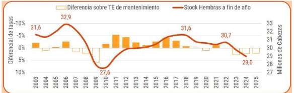 En los últimos años, la Argentina registró tasas de extracción persistentemente superiores al nivel de equilibrio, lo que derivó en una continua liquidación de vientres. Según CREA, este comportamiento puede asociarse a las necesidades de liquidez de los productores y a un contexto financiero poco favorable, aunque estratégicamente sería necesario retener más hembras para aumentar la oferta futura de carne.