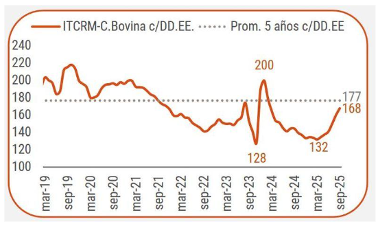 Según el reporte, el ITCRM-Carne mostró una recuperación importante en los últimos meses, luego de haber tocado un mínimo de 132 puntos en el primer trimestre del año. No obstante, el indicador aún se encuentra por debajo del promedio histórico de 177 puntos registrado entre 2019 y 2025, período caracterizado por una elevada variabilidad de escenarios.