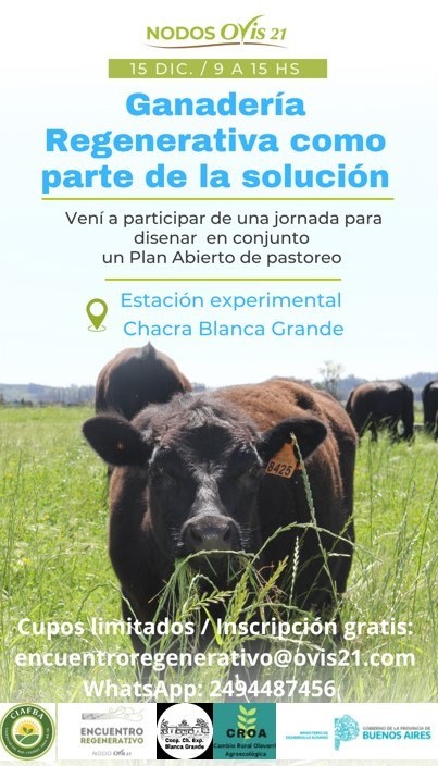 El miércoles 15 de diciembre de 9 a 15 hs se desarrollará en la Chacra Experimental Blanca Grande un encuentro sobre Ganadería Regenerativa, organizado en conjunto por el equipo de la chacra encabezado por el ingeniero agrónomo Alejandro Giaquinta y el proyecto Ovis 21, impulsor de la temática, que incluyó a la Chacra dentro del nodo Tandil. El encuentro es gratuito pero con cupos limitados, debiendo inscribirse al email: encuentroregenerativo @ ovis21.com o Whatsapp 2494 487456