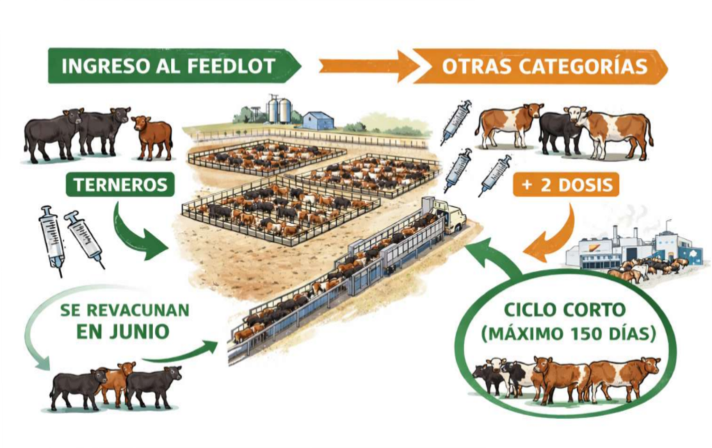 - Engordes a corral (Feedlots): Se ha modificado su clasificación, eliminando el concepto de establecimiento de riesgo (ERS). Los feedlots que opten por la estrategia de vacunación sistemática quedarán exceptuados de la primera campaña de totales de 2026, vacunando sus terneros únicamente en la segunda campaña.