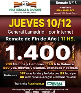 El 18vo, remate mensual y el último del 2020 de la firma de General La Madrid se desarrollará a través de rural.com.ar. Los detalles